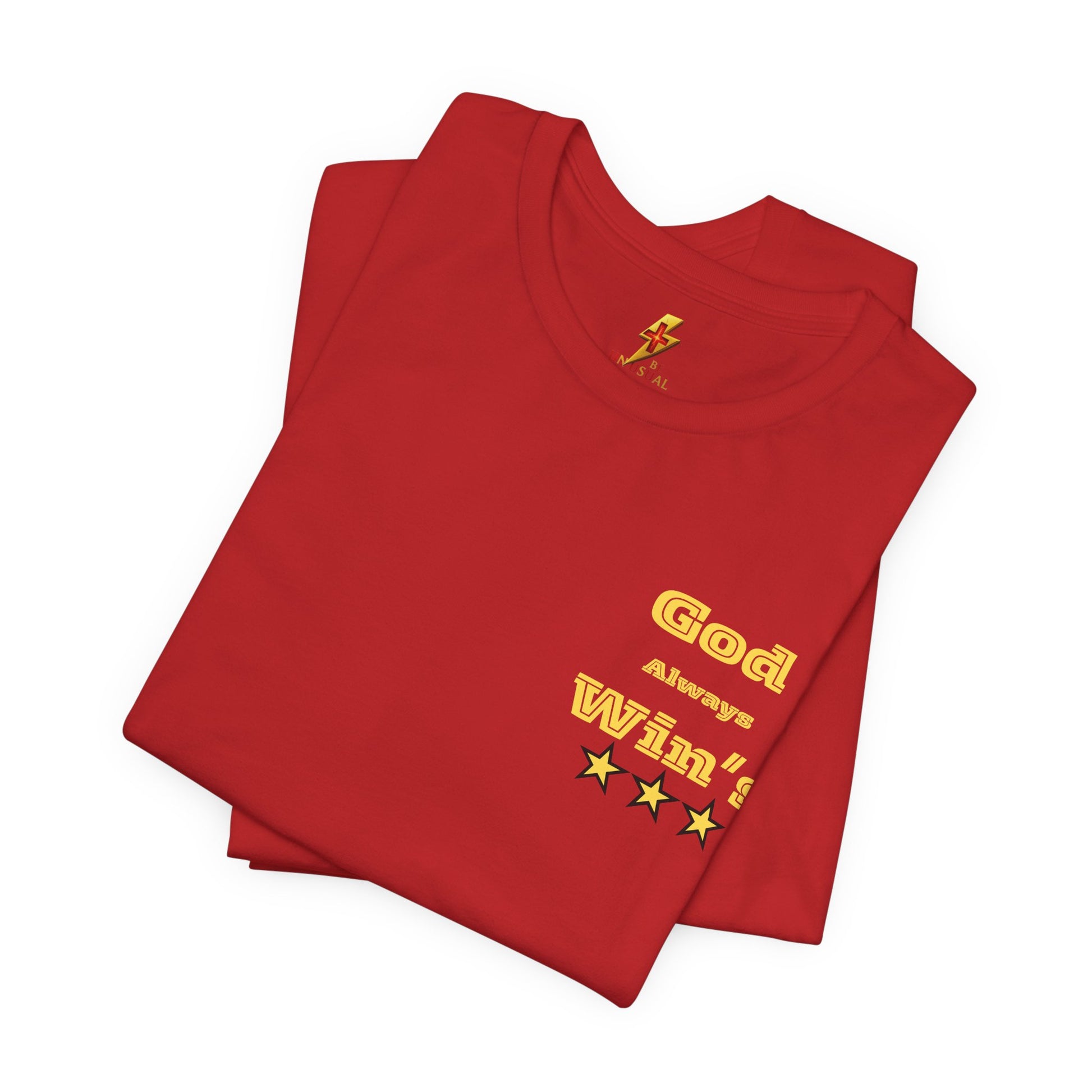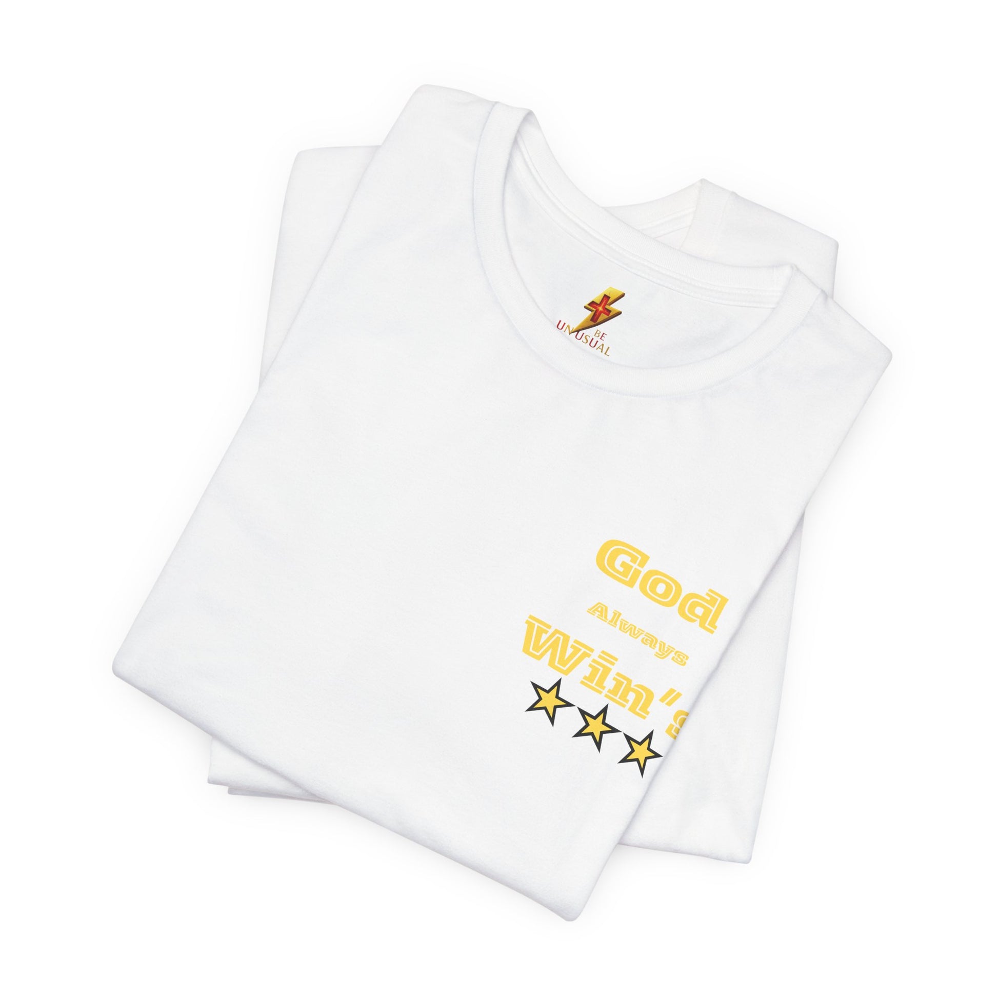 Inspirational God Always Wins T-Shirt for adults made with 100% lightweight Airlume cotton, perfect for active and leisure wear. The retail fit and classic crew neckline make it suitable for casual and semi-formal settings. This T-Shirt gives a positive and uplifting vibe, ideal for those looking for motivation. Perfect for wearing on spiritual occasions or as a reminder of faith.